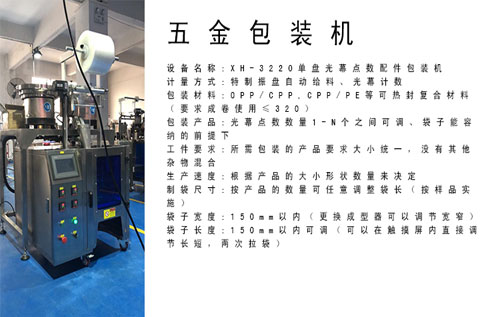 應(yīng)用于各種五金螺絲包裝,電子零件包裝,電子元器件包裝及食品包裝。螺絲包裝機(jī)可單款產(chǎn)品包裝,可多款產(chǎn)品混合包裝,包裝數(shù)量包裝袋長度可自由調(diào)節(jié),自動(dòng)送料、自動(dòng)計(jì)數(shù)、自動(dòng)封口、自動(dòng)包裝.五金件自動(dòng)包裝機(jī)還應(yīng)用于各種顆粒狀食品等各種行業(yè)實(shí)現(xiàn)自動(dòng)化計(jì)數(shù)包裝,檢測(cè),打標(biāo)等,為適應(yīng)于不同工件的上料需求設(shè)計(jì)制作了不同型號(hào).為專業(yè)化,標(biāo)準(zhǔn)化的生產(chǎn)進(jìn)一步提高了產(chǎn)品的穩(wěn)定性,一致性,降低了成本,為出優(yōu)質(zhì)產(chǎn)品提供了可靠的保證。