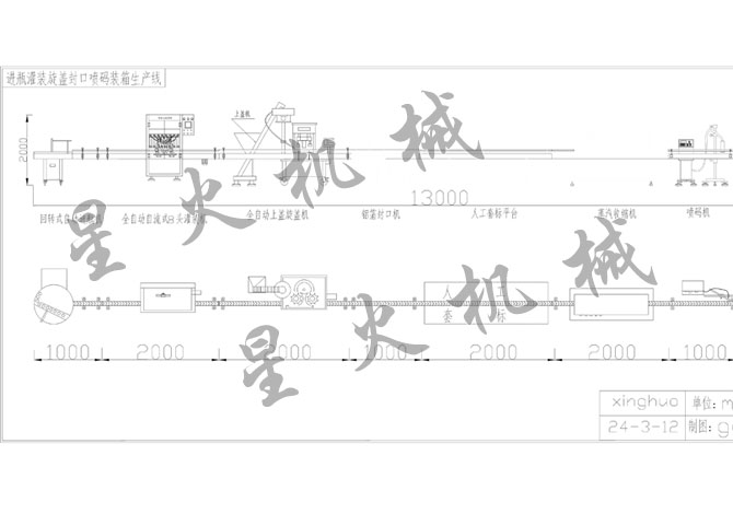 理瓶2頭灌裝真空旋蓋貼標(biāo)噴碼收瓶及開箱封箱打包生產(chǎn)線