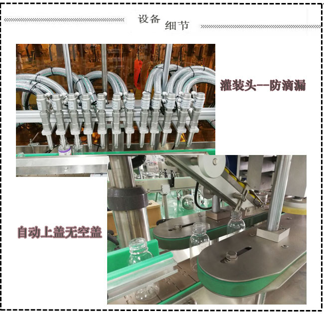 2、采用防高泡產(chǎn)品的灌裝升降系統(tǒng)、雙重防滴漏與拉絲的灌裝悶頭、確保瓶口定位的液位控制和定位系統(tǒng)。