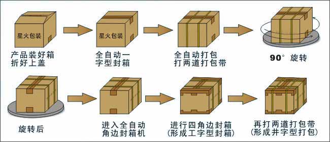 本包裝生產(chǎn)流水線主要操作流程:已裝好產(chǎn)品折好上蓋的產(chǎn)品箱從左邊的滾筒進(jìn)入此流水線,進(jìn)入第1臺(tái)包裝機(jī)械:全自動(dòng)一字型封箱機(jī)(進(jìn)行一字型封箱)—→進(jìn)入第二臺(tái)包裝機(jī)械:全自動(dòng)打包機(jī)(打兩道打包帶)—→進(jìn)入第三臺(tái)包裝機(jī)械:90°旋轉(zhuǎn)機(jī)—→進(jìn)入第四臺(tái)包裝機(jī)械:全自動(dòng)角邊封箱機(jī)(進(jìn)入四角邊封箱,形成工字型封箱)—→進(jìn)入較后的第五臺(tái)包裝機(jī)械:全自動(dòng)打包機(jī)(打另外兩道的打包帶,形成井字形打包)—→工字型封箱+井字型打包完成。